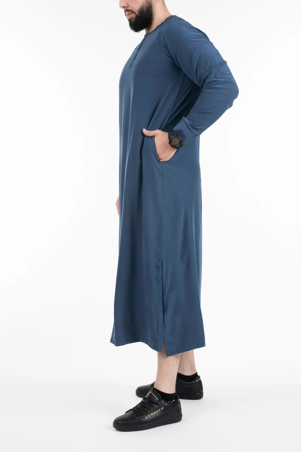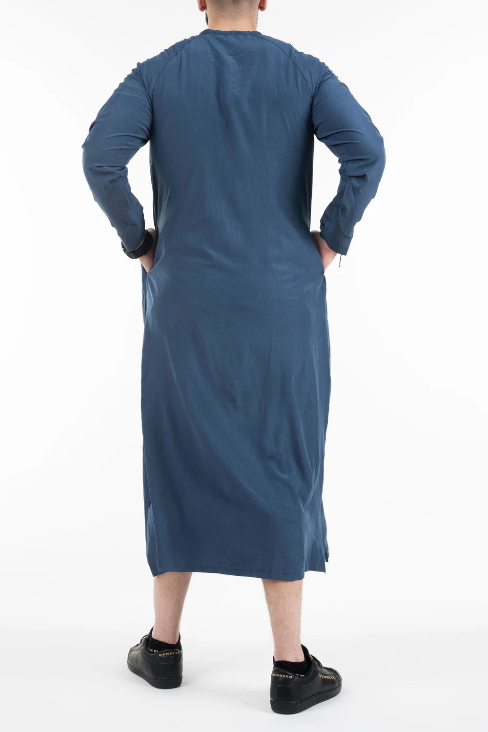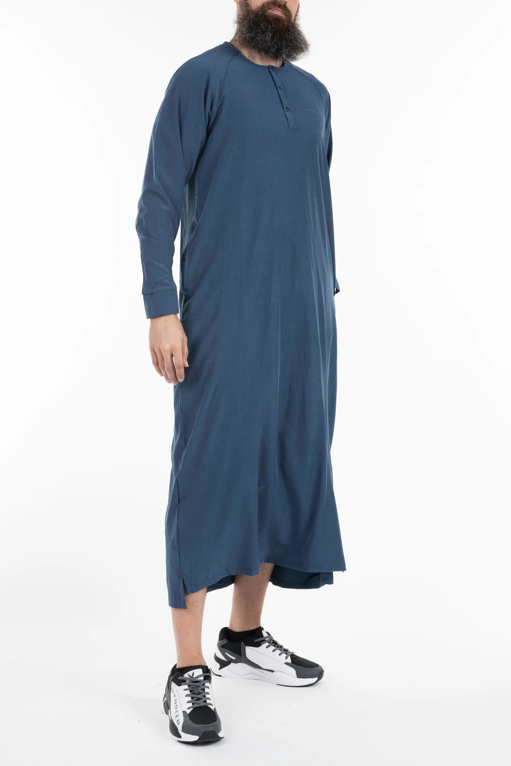 Le qamis Jumeirah, style emiratis, tissu ultra fluide, look sobre, col rond, ouverture à pressions, ajustement de l'ouverture des manches par bouton pression, poches latérales. Le nouveau Game du Qamis !
