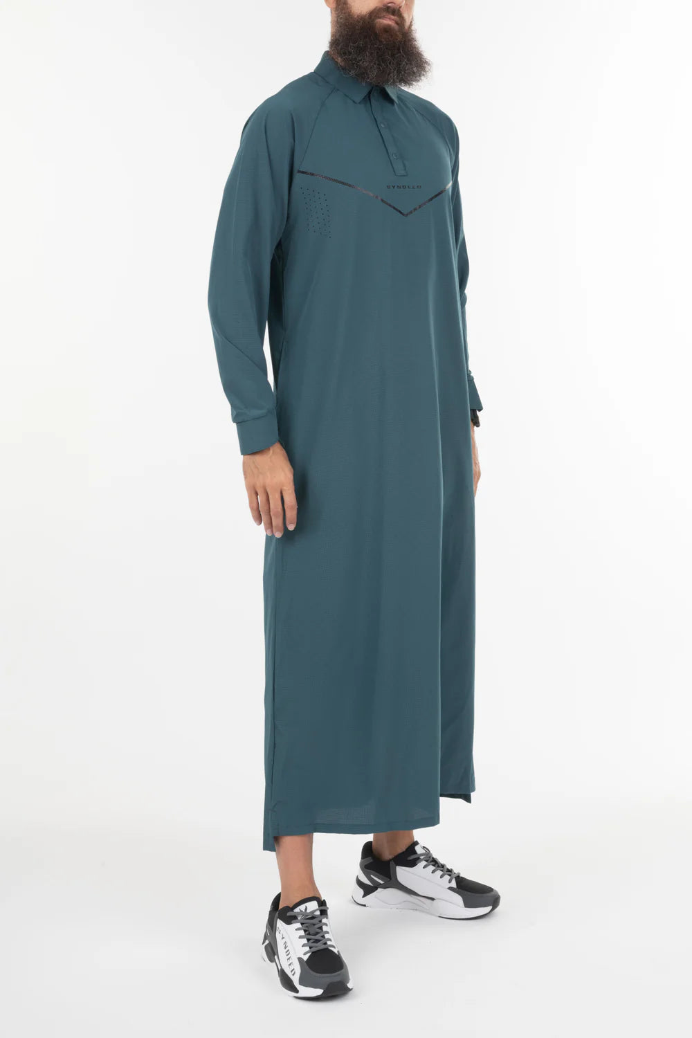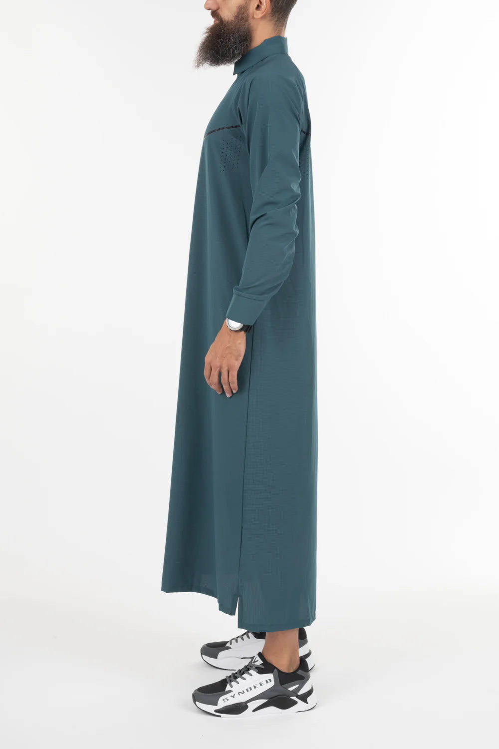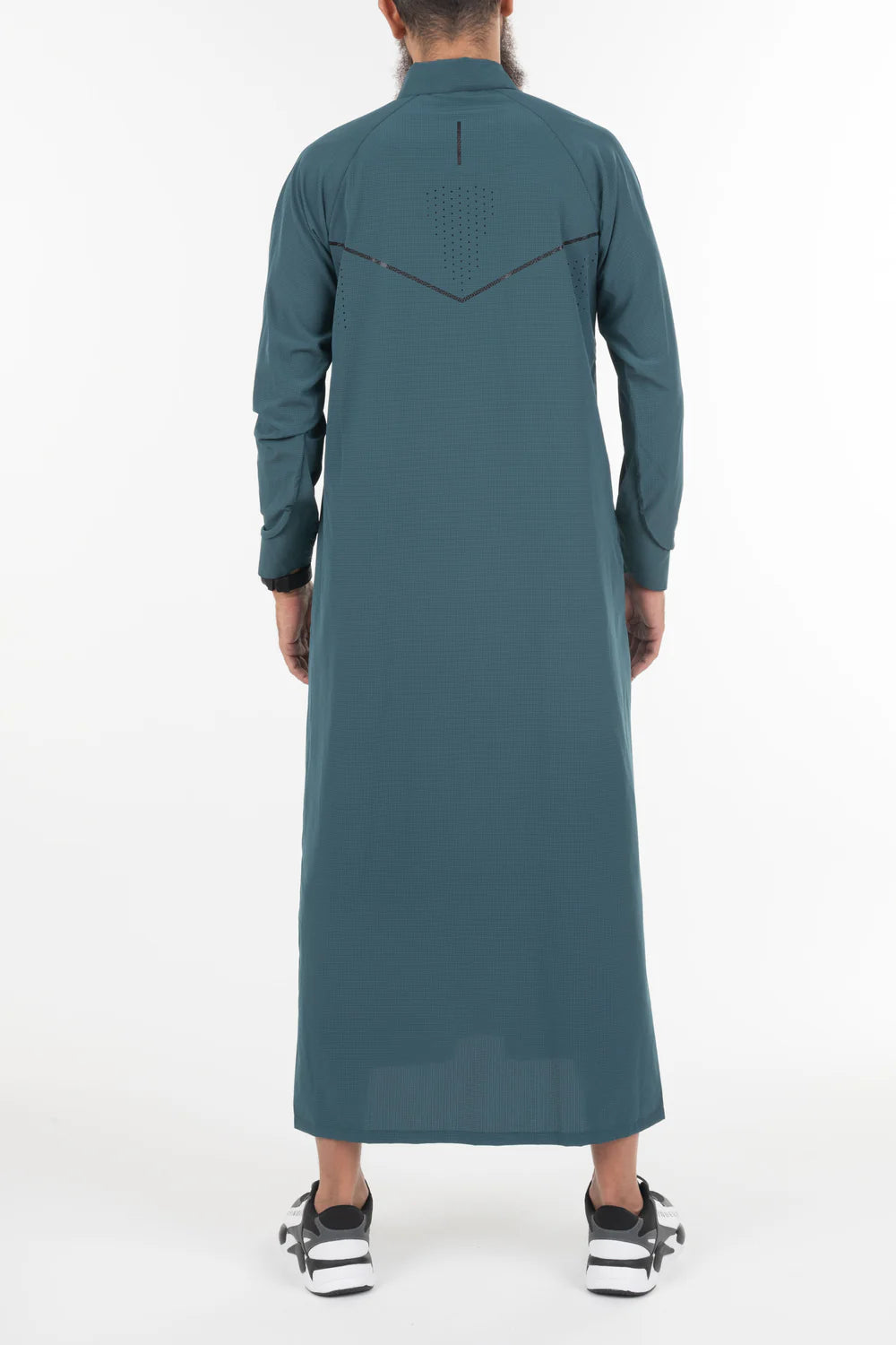 Le qamis Jeddah est le dernier né de notre collection de qamis techwear, matière légère, trous d'aération, sur la poitrine, au dos, et sur les cotés, look sportif, col classique en pointe, ouverture à pressions, ajustement de l'ouverture des manches, poches latérales.