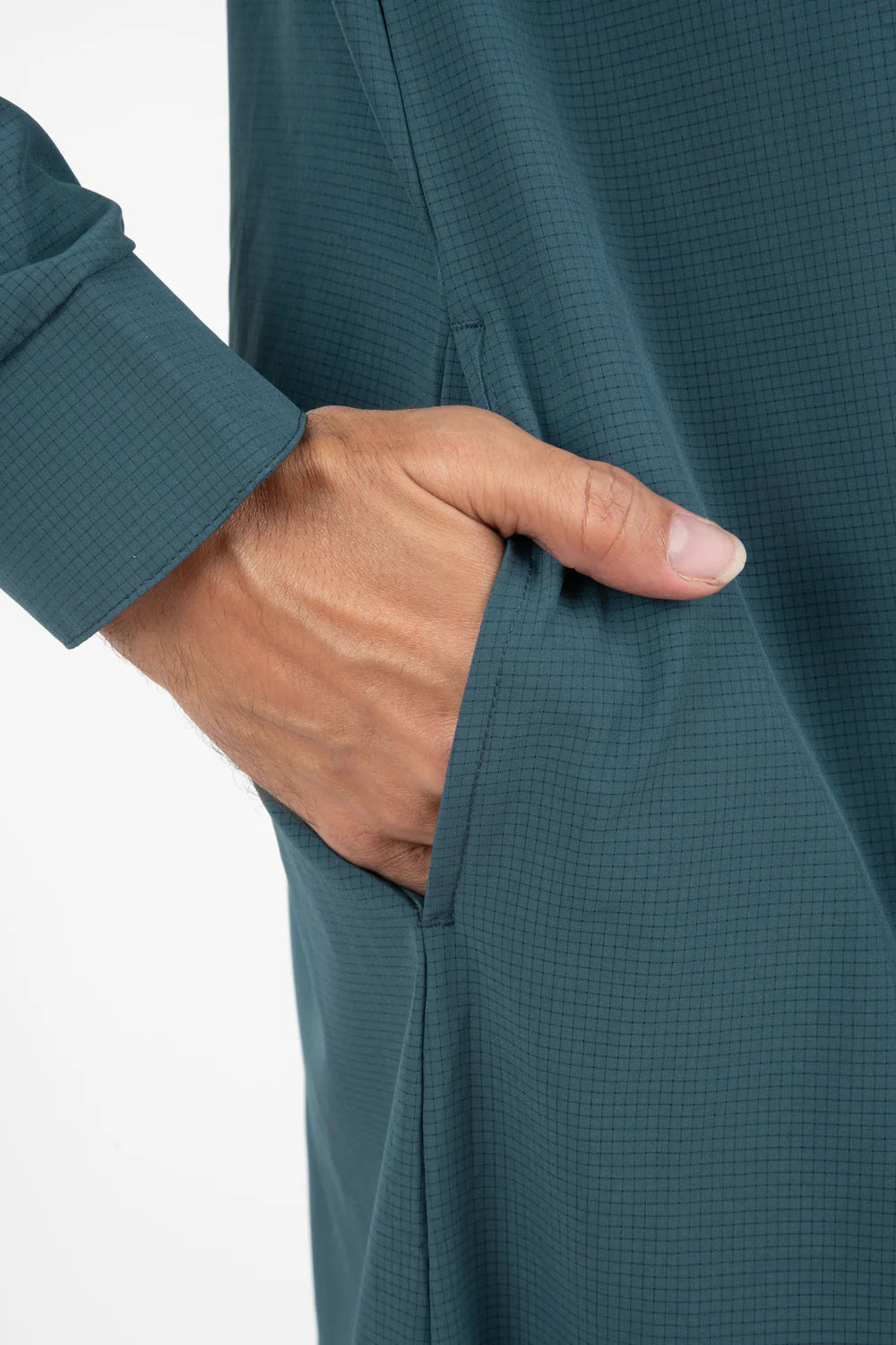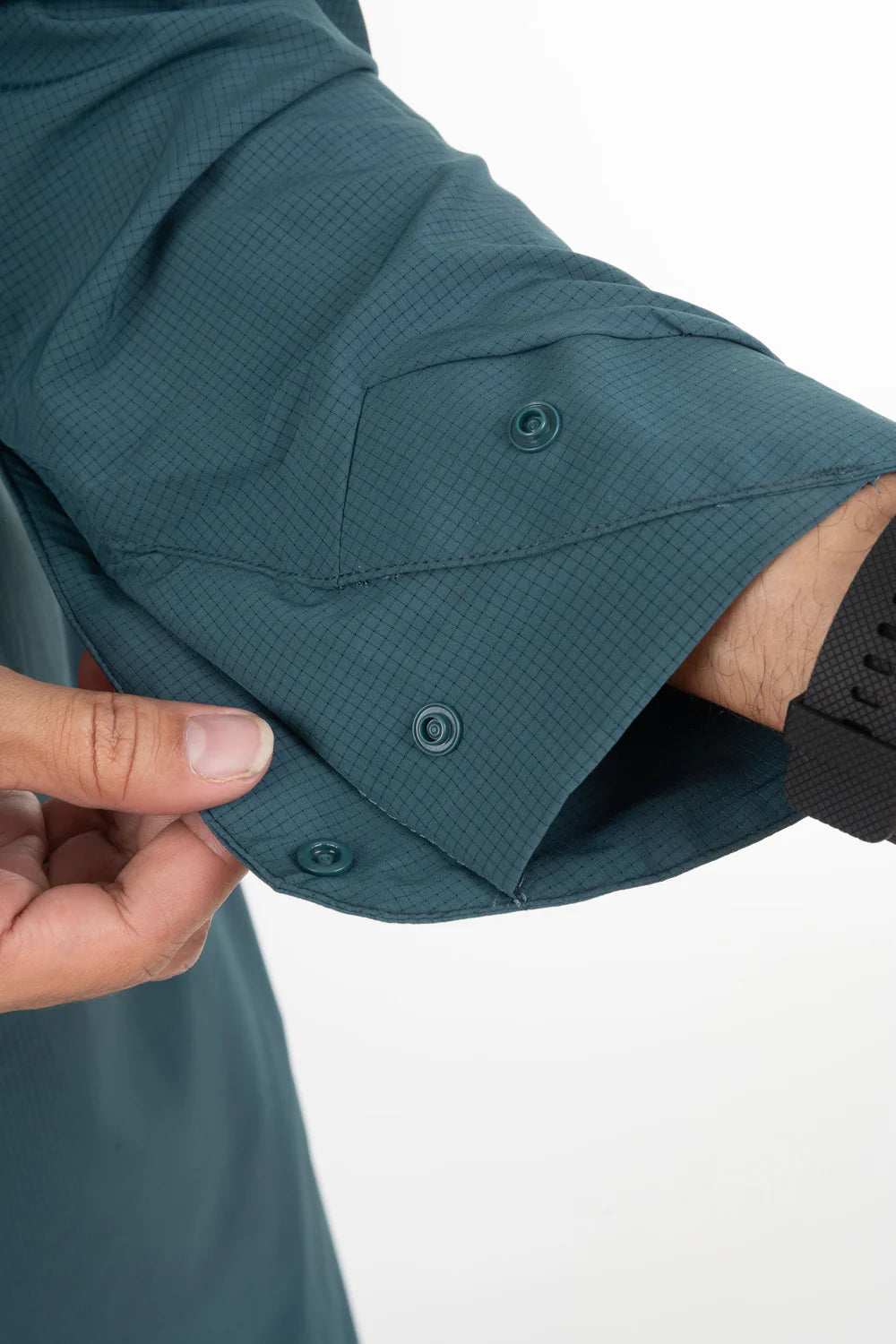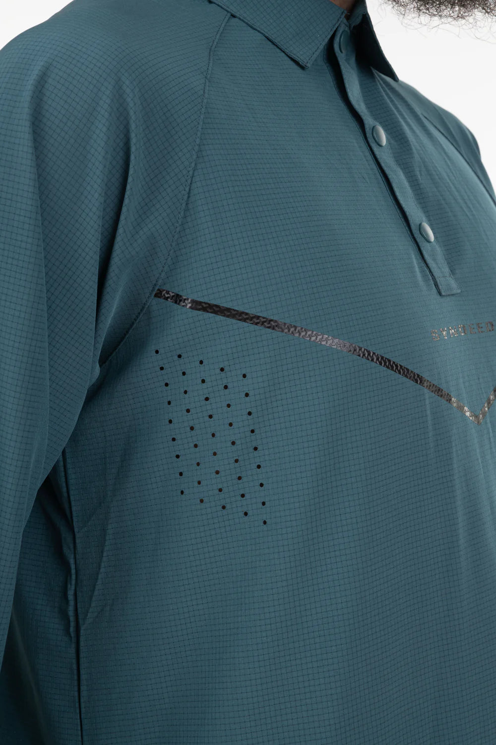 Le qamis Jeddah est le dernier né de notre collection de qamis techwear, matière légère, trous d'aération, sur la poitrine, au dos, et sur les cotés, look sportif, col classique en pointe, ouverture à pressions, ajustement de l'ouverture des manches, poches latérales.