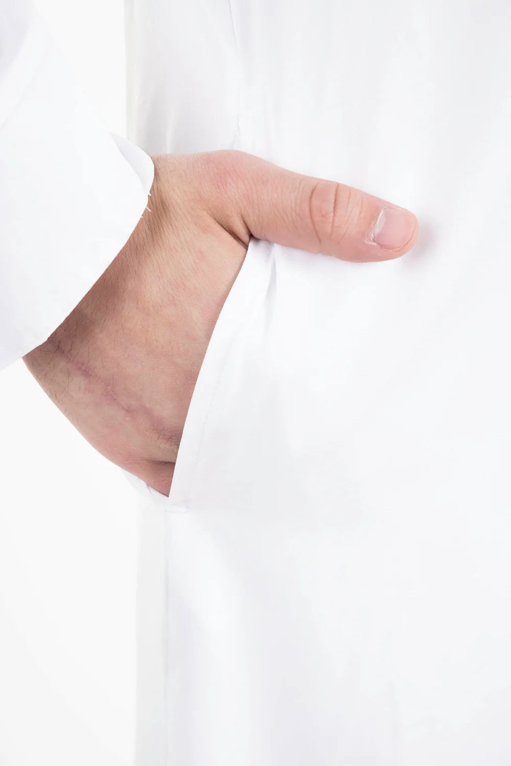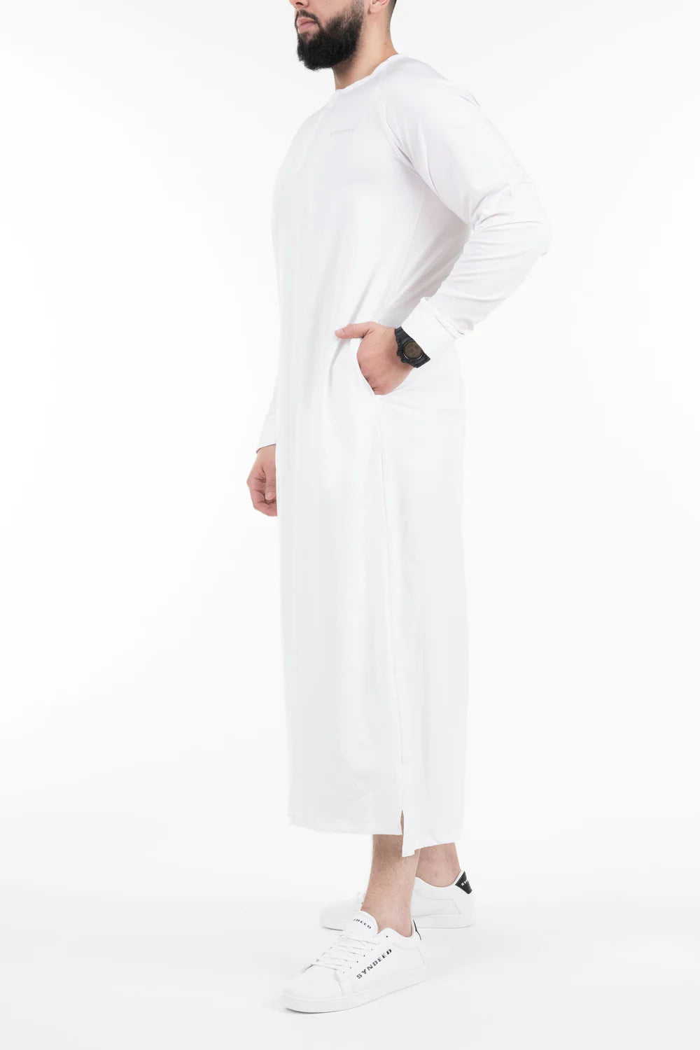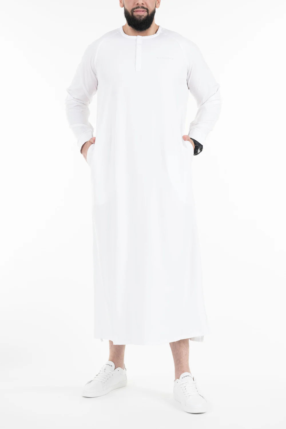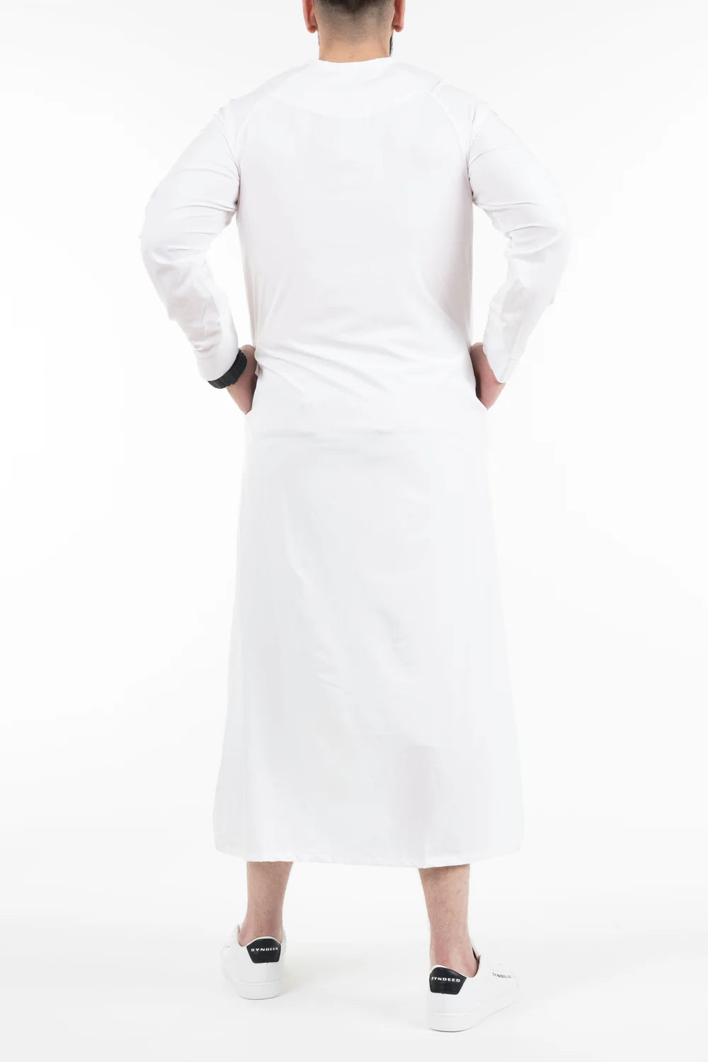Le qamis Jumeirah, style emiratis, tissu ultra fluide, look sobre, col rond, ouverture à pressions, ajustement de l'ouverture des manches par bouton pression, poches latérales. Le nouveau Game du Qamis !