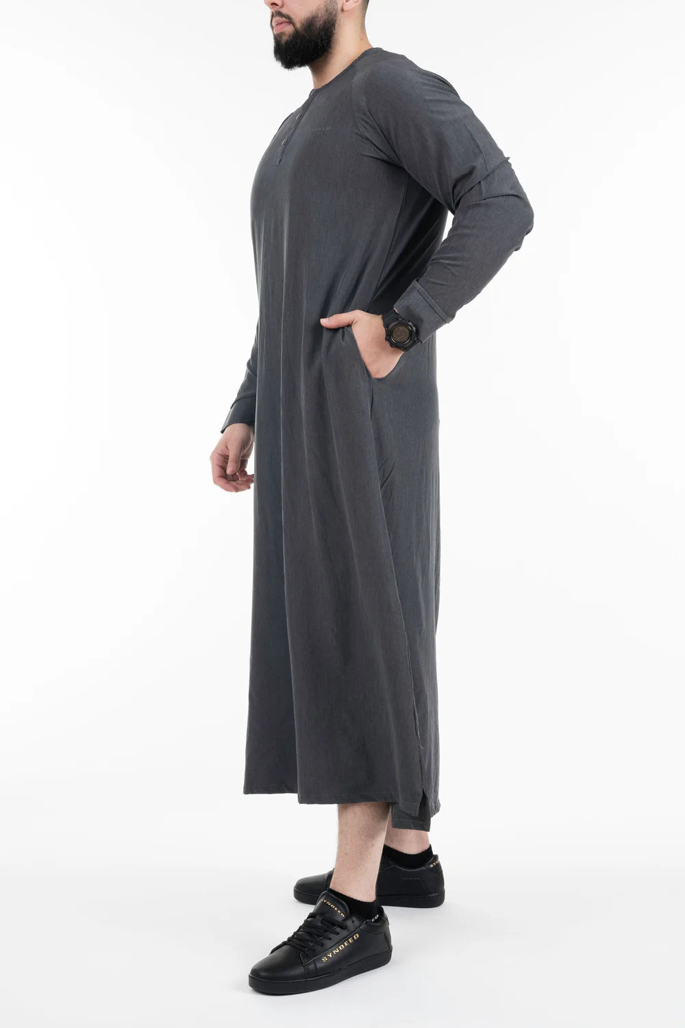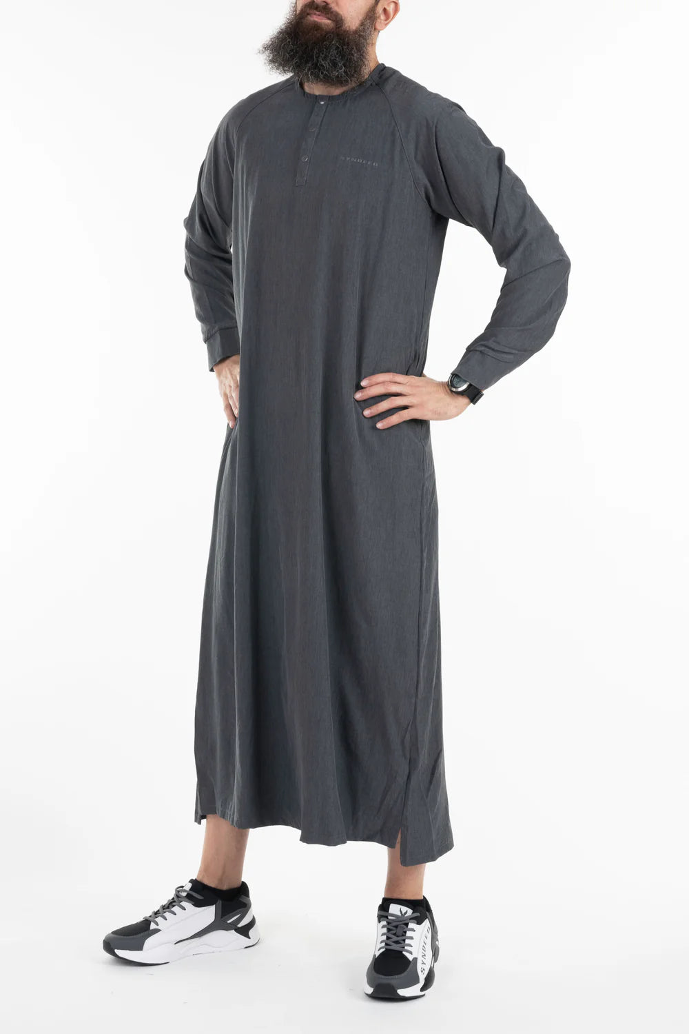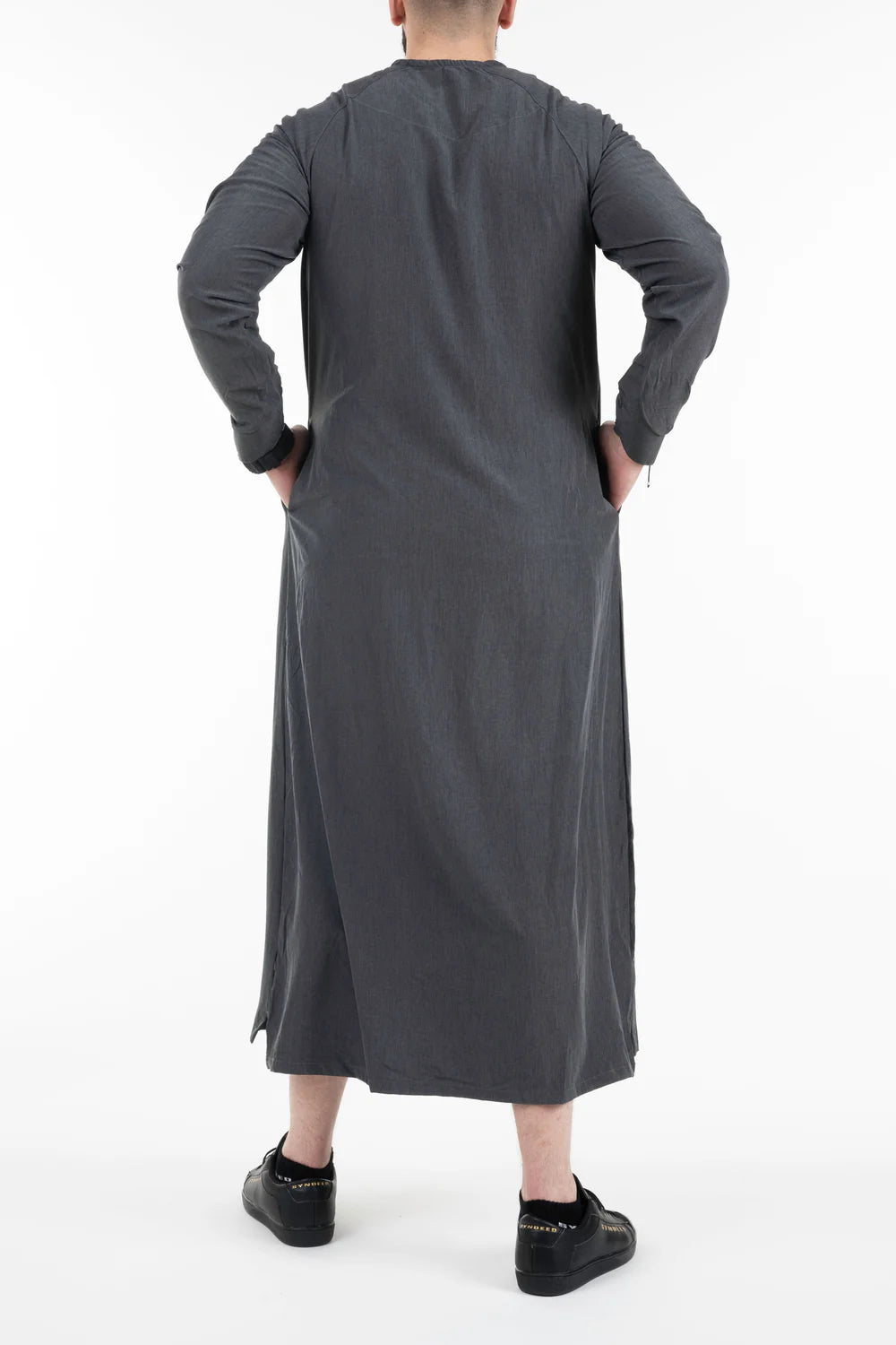 Le qamis Jumeirah, style emiratis, tissu ultra fluide, look sobre, col rond, ouverture à pressions, ajustement de l'ouverture des manches par bouton pression, poches latérales. Le nouveau Game du Qamis !