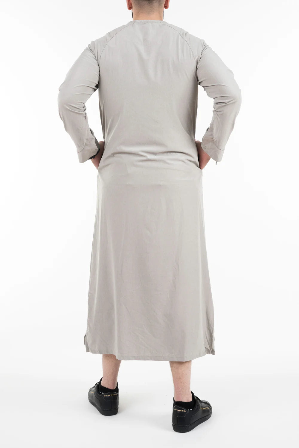 Le qamis Jumeirah, style emiratis, tissu ultra fluide, look sobre, col rond, ouverture à pressions, ajustement de l'ouverture des manches par bouton pression, poches latérales. Le nouveau Game du Qamis !