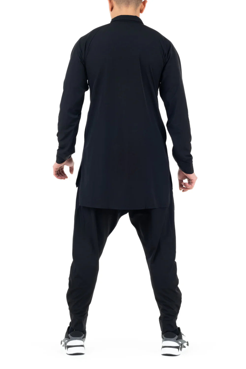 Ensemble haut manches longues + saroual, matière ultra-légère, look décontracté, col chemise, ouverture pressions, poches latérales.