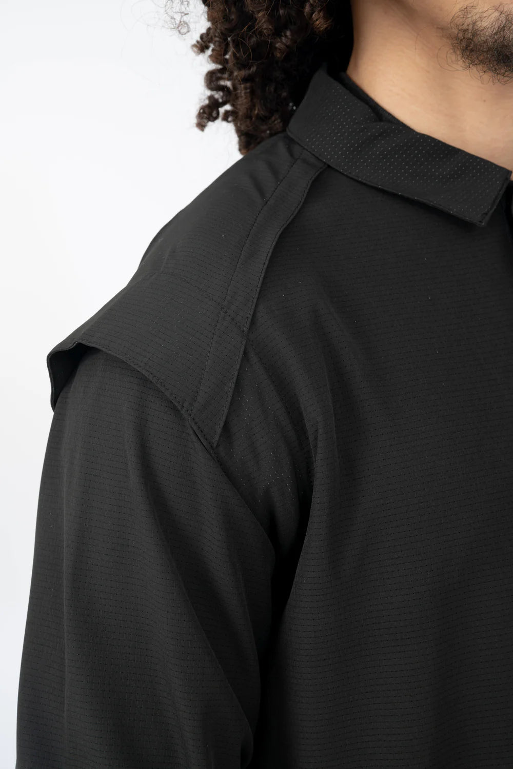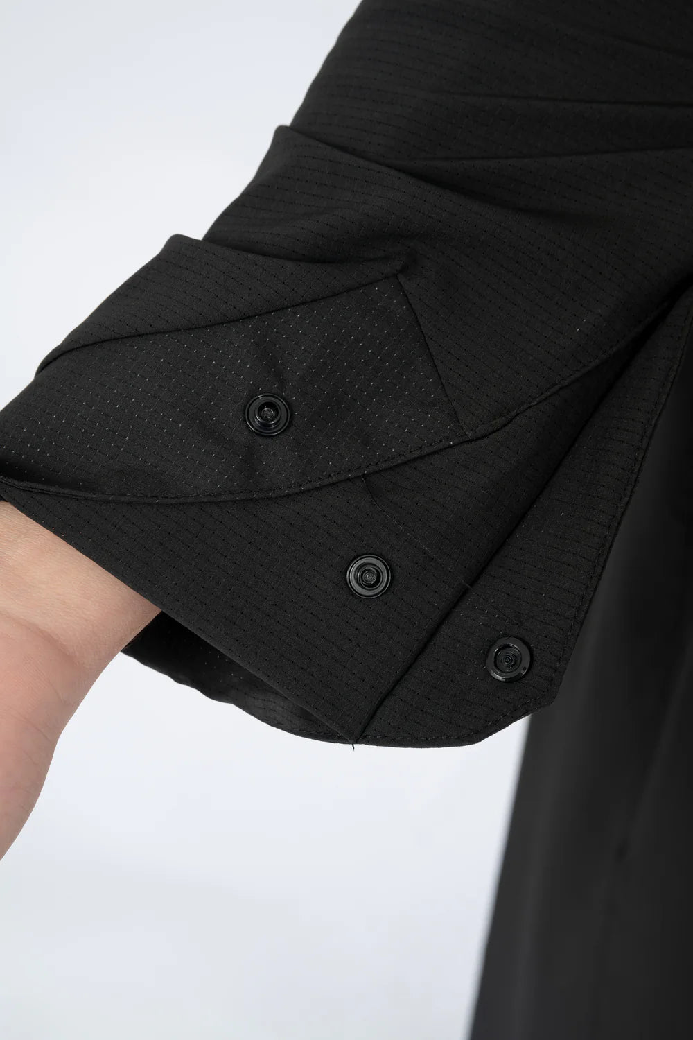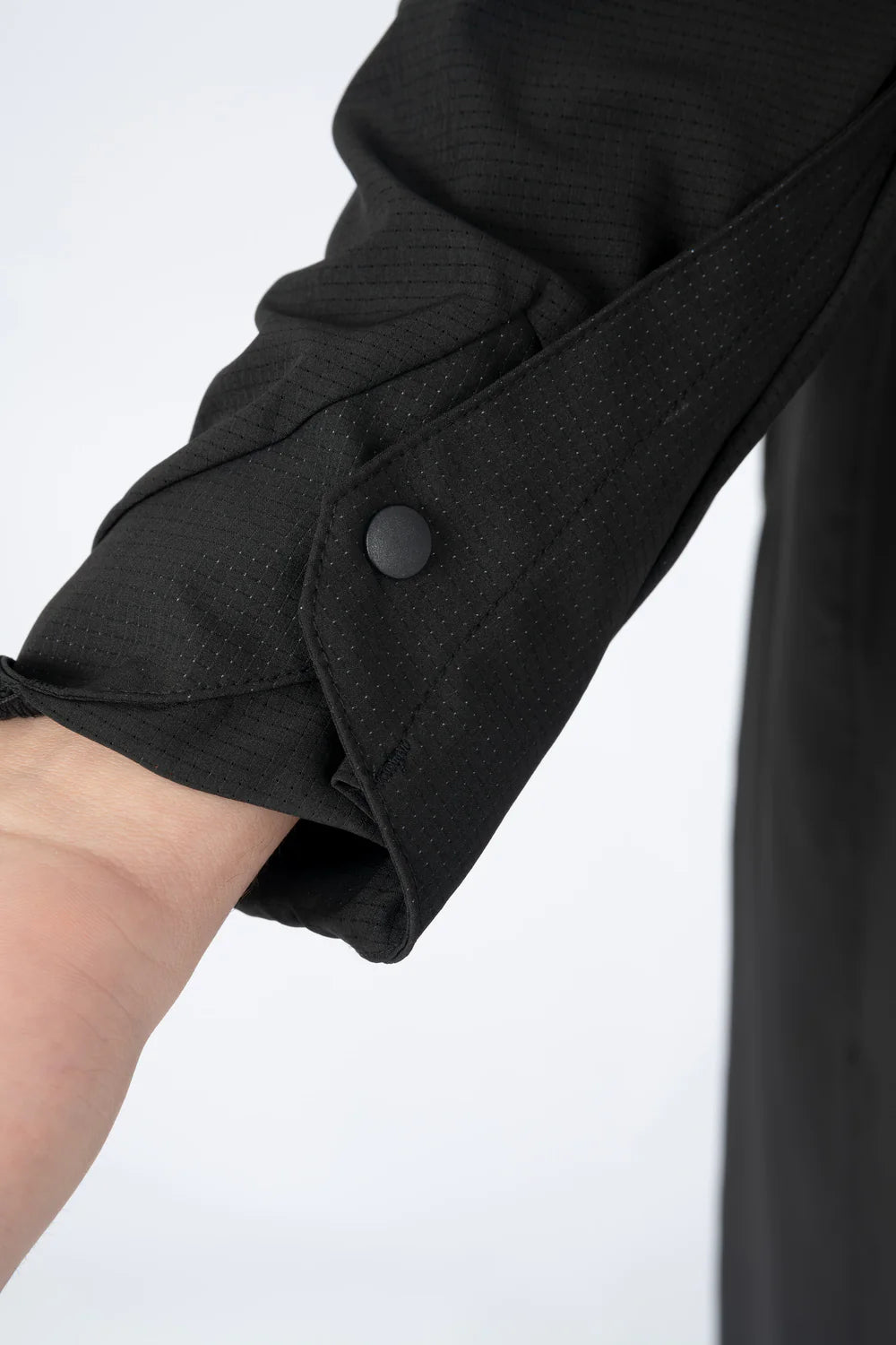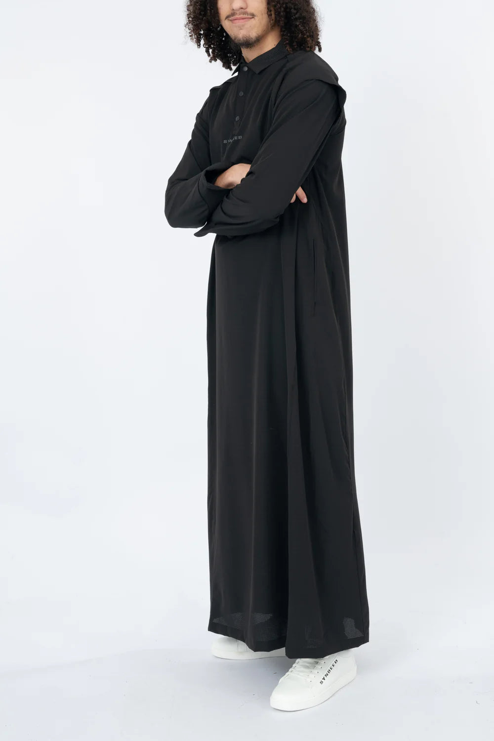 Le qamis Riyadh de notre collection de qamis techwear, en matière légère et micro-perforée, look classe, col classique en pointe, ouverture à pressions, ajustement de l'ouverture des manches, poches latérales. Le Level-Up du Qamis !
