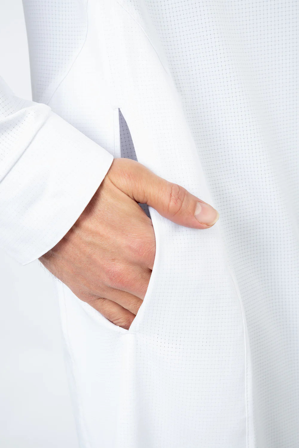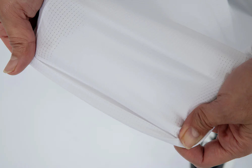 Le qamis Riyadh de notre collection de qamis techwear, en matière légère et micro-perforée, look classe, col classique en pointe, ouverture à pressions, ajustement de l'ouverture des manches, poches latérales. Le Level-Up du Qamis !